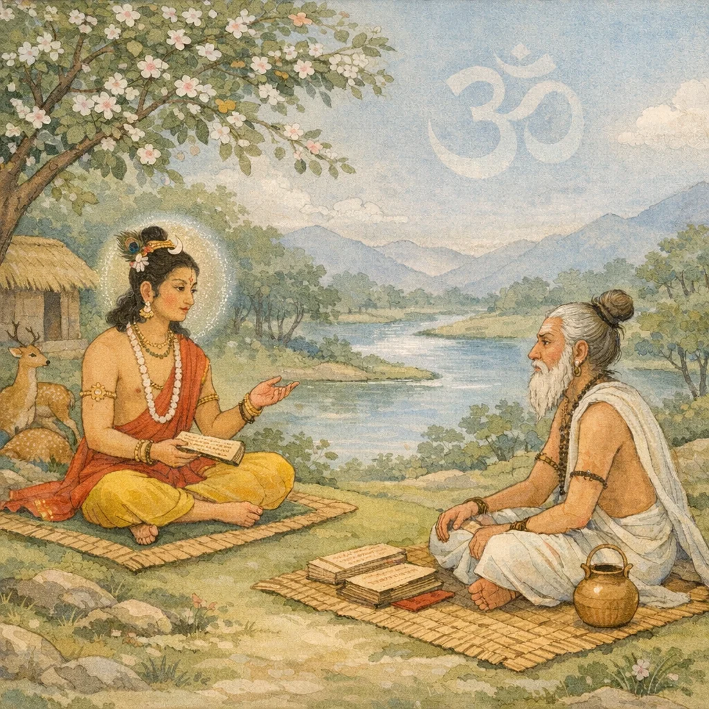 Then, clearly pronouncing the aphorism, “Now, therefore, one should inquire into Dharma,” he should again, without delay, recite: “Now, therefore, the inquiry into Brahman”—and likewise repeat the Vedas and the other sacred texts.