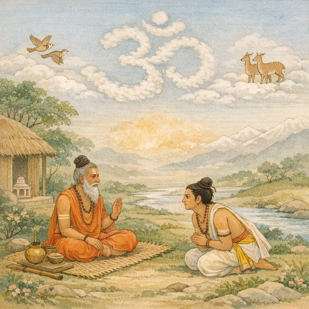 Adhyāya 16 unfolds as a teaching dialogue. Sūta describes how a learned disciple moves from received Vedic instruction to a subtler metaphysical inquiry. Vāmadeva, having “drunk” from the guru’s mouth the nectar-like meaning of the praṇava (oṃ), says his former doubt is cleared, yet asks a deeper question: the world is plainly formed in paired modes—strī/puṃ (female/male)—from Sadāśiva down to the tiniest beings. If the jagat everywhere displays sexual polarity, what is its eternal cause (kāraṇa): female, male, neuter (napuṃsaka), mixed, or something beyond all such categories? The chapter thus stages a classical Shaiva examination of the relation between ultimate reality (Paramātman), manifest differentiation (nāma-rūpa), and the embodied instruments of knowing (body, senses, mind, intellect, ego) that generate dispute. The cited verses place controversy not in the Self’s nature but in embodied cognition, urging one to see the limits of ordinary vyavahāra (“I know,” “I do”) and to re-center on the all-pervading Self, self-evidently established as the inner reality of all (sarvātma-saṃsiddha).