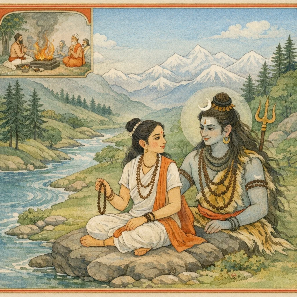 Thereafter, by that divine influence, the Goddess was born as the daughter of Himavān (the Lord of the Himalayas). Following Nārada’s instruction, she undertook austerities for the sake of attaining Śiva.