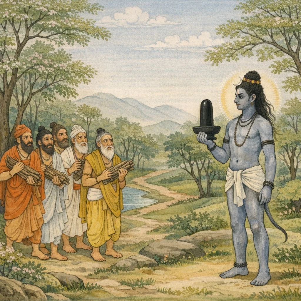 Adhyāya 12 begins with the ṛṣis addressing Sūta as an authoritative transmitter by Vyāsa’s grace and asking the cause of two linked matters: why the liṅga is worshipped in the world as the true principle already taught, and why Pārvatī, Śiva’s beloved, is famed in “bāṇa-rūpa” (a pointed, arrow-like emblematic form). Sūta replies by placing the explanation within a kalpa-bheda account received from Vyāsa and introduces the Dāruvana forest episode as the frame. A forest of Śiva-devoted ascetics is described—performing tri-kāla pūjā, chanting hymns, and abiding in constant dhyāna—who go out to gather samidh. In their absence, Śaṅkara appears directly as Nīla-Lohita, deliberately assuming a disturbing, virūpa, digambara guise, smeared with bhūti, holding a liṅga in his hand and performing provocative acts explicitly “for testing” (parīkṣārtha). Through this narrative provocation, the chapter grounds the Purāṇic theology of symbol: the liṅga is not a mere object but a doctrinal sign of Śiva-tattva, rightly recognized through inner discernment (bhāva) no less than outer rite (kriyā).