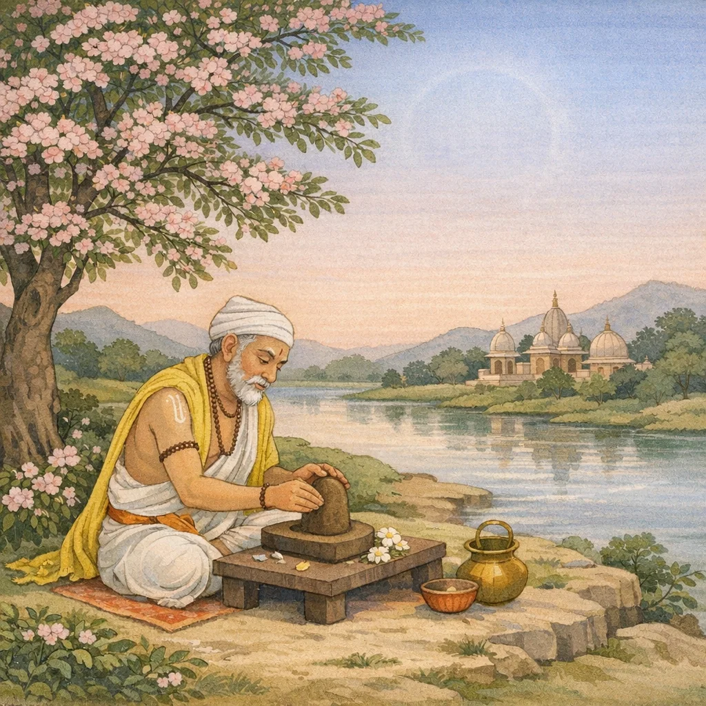 Endowed with the rite of maintaining the sacred fires (agnyādhāna) and ever devoted to the worship of Śiva, that twice-born brāhmaṇa worshipped each day an earthen form (pārthiva-mūrti) as a support for Śiva’s presence.