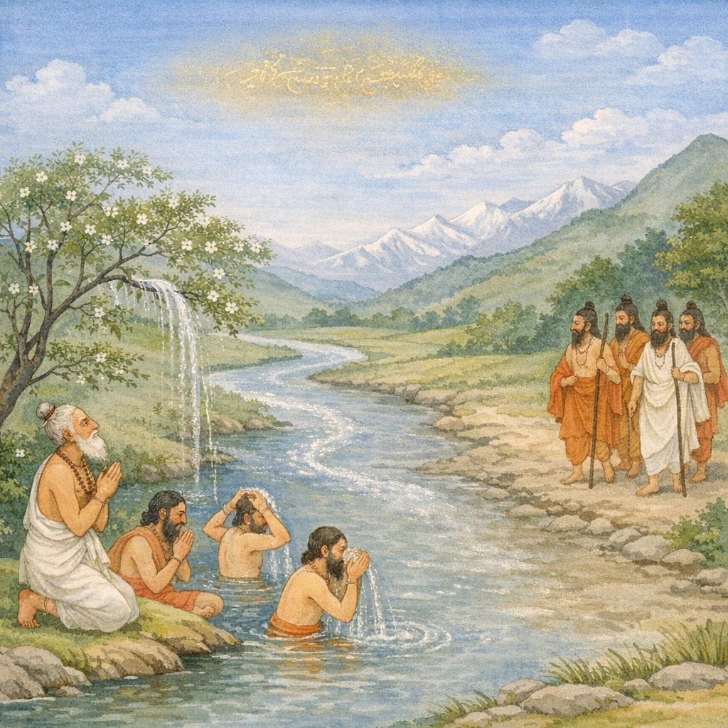 There, Gautama quickly spoke the words, “Come to me.” Again and again he praised the Goddess Gaṅgā, standing with joined palms and his head bowed in reverence.
