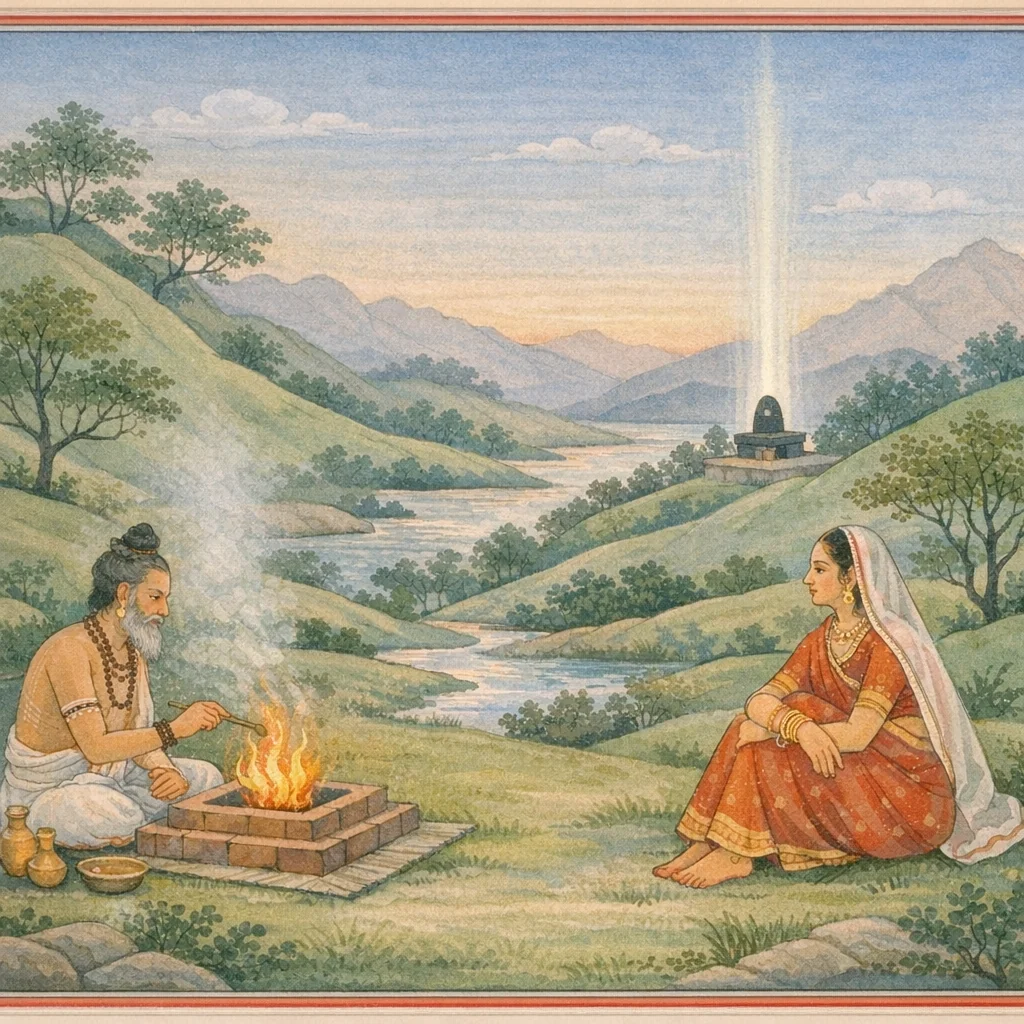 The jyotirliṅga functions as the ‘locus of accessibility’ for transcendent Śiva: sacred geography (diśā + giri + kṣetra) encodes a theology where place, discipline (sandhyā/agni), and moral steadiness become conduits for anugraha. Sudharmā’s non-grief grounded in ātma-jñāna models inner purification, while the unresolved desire for progeny marks the boundary where ritual-site grace complements philosophical composure.