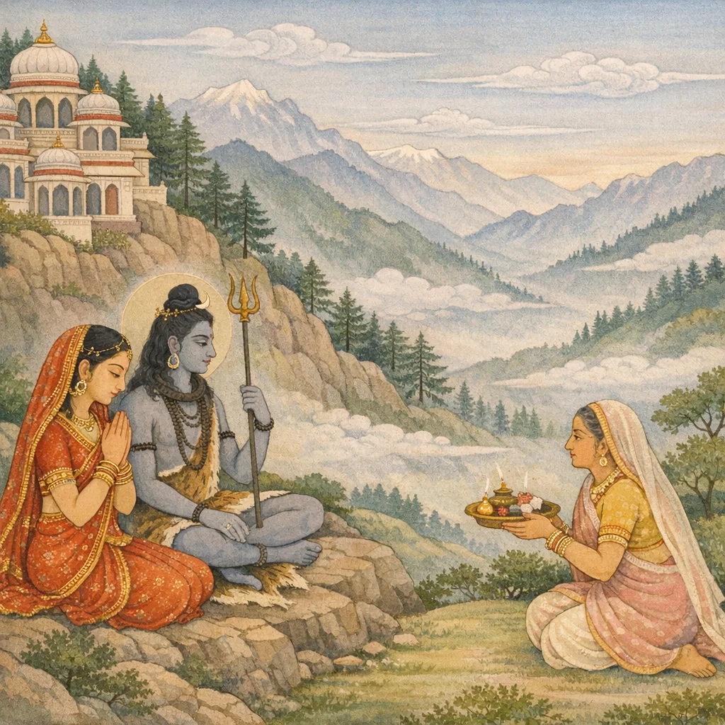 Satī, having cast off her former body, fixed in her heart the resolve, “I shall become her daughter,” and set her mind on being born as Himavān’s daughter, so that the divine union with Śiva might be fulfilled again in purity and in accord with Dharma.