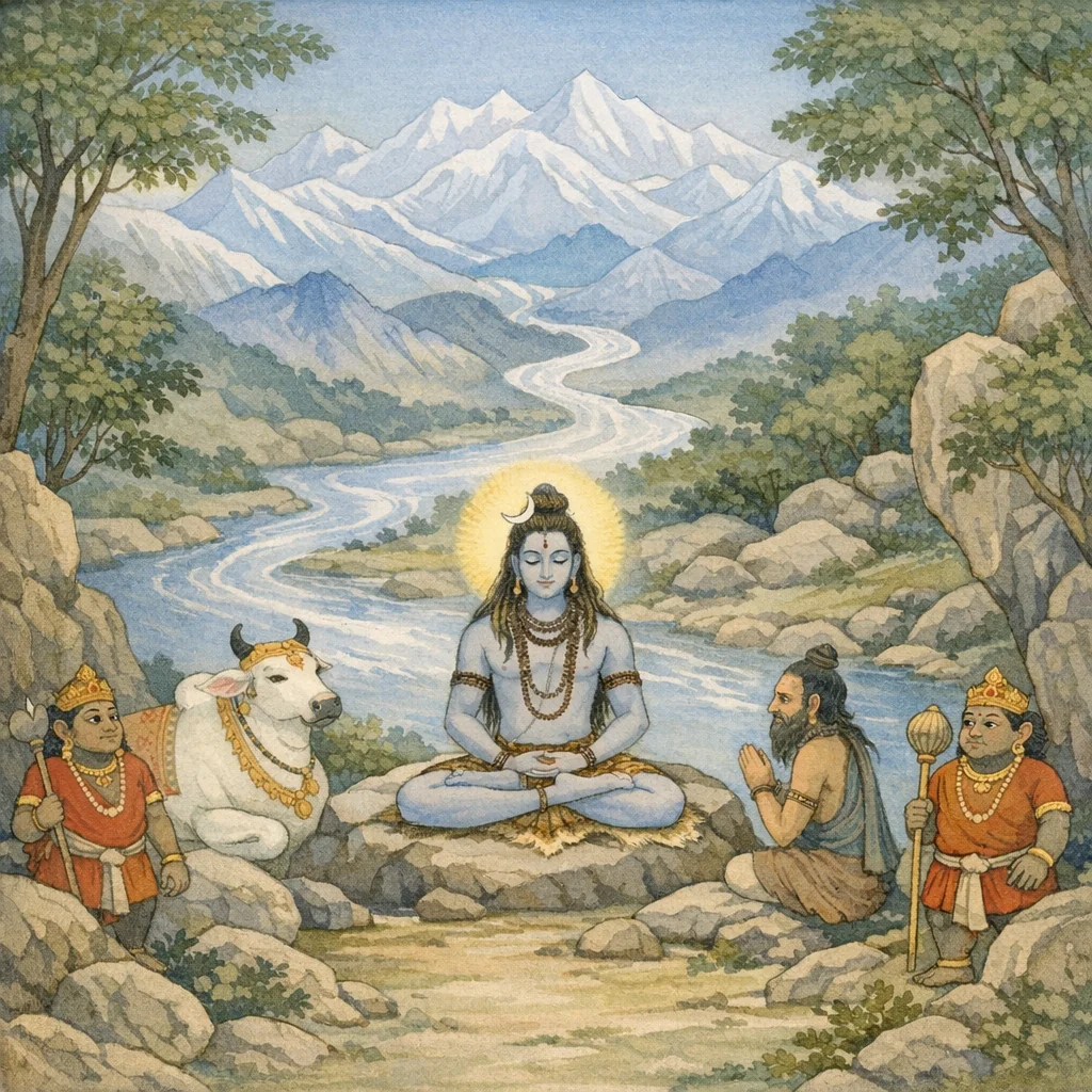 Śiva appears as Śambhu/Śaṅkara/Haṛa in a tapas-dhyāna mode; the gaṇas manifest complementary roles as meditators, attendants, and silent gatekeepers, modeling service (sevā) and restraint (mauna) around the divine yogin.