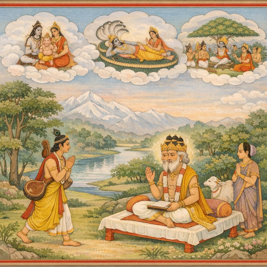Adhyāya 14 begins a didactic dialogue in which Nārada asks Brahmā for a precise, complete account of: who Tārakāsura is and how he oppressed the devas; how Śaṅkara burned Kāma (Smara) to ashes; and how Śivā, though the primordial Ādiśakti, performed intense tapas and attained Śambhu as her husband. Brahmā answers by setting these questions within a cosmic genealogy: from Marīci → Kaśyapa and Kaśyapa’s wives (especially Diti) arise Hiraṇyakaśipu and Hiraṇyākṣa. Viṣṇu destroys them as Narasiṃha and Varāha, restoring divine security, yet the tale serves as a prelude to the later asuric menace of Tāraka and the need for Śiva–Śivā’s salvific intervention to reassert dharma.