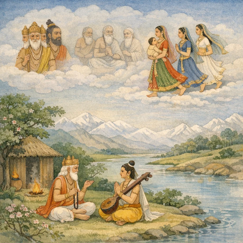 Adhyāya 2 unfolds as a doubt-clearing dialogue: Nārada asks Brahmā to explain Menā’s origin (menotpatti) and to disclose any relevant curse (śāpa), so that uncertainty may be removed. Brahmā answers by placing the account within earlier creation lineages, beginning with Dakṣa, his descendants, and marital alliances with sages such as Kaśyapa. In this genealogical setting, Svadhā is given to the Pitṛs, and from Svadhā arise three daughters—Menā (eldest), Dhanyā (middle), and Kalāvatī (youngest)—said to be mind-born (mānasa-udbhava) and commonly regarded as ayonijāḥ (not womb-born). The chapter stresses the spiritual merit of hearing and reciting these auspicious names, praising them as vighna-hara (obstacle-removing) and mahā-maṅgala-dā (bestowing great auspiciousness). It further portrays the daughters as world-venerated, mothers of the worlds, yoginīs, and vessels of supreme knowledge moving through the three worlds, thus elevating genealogy into a devotional and metaphysical teaching.