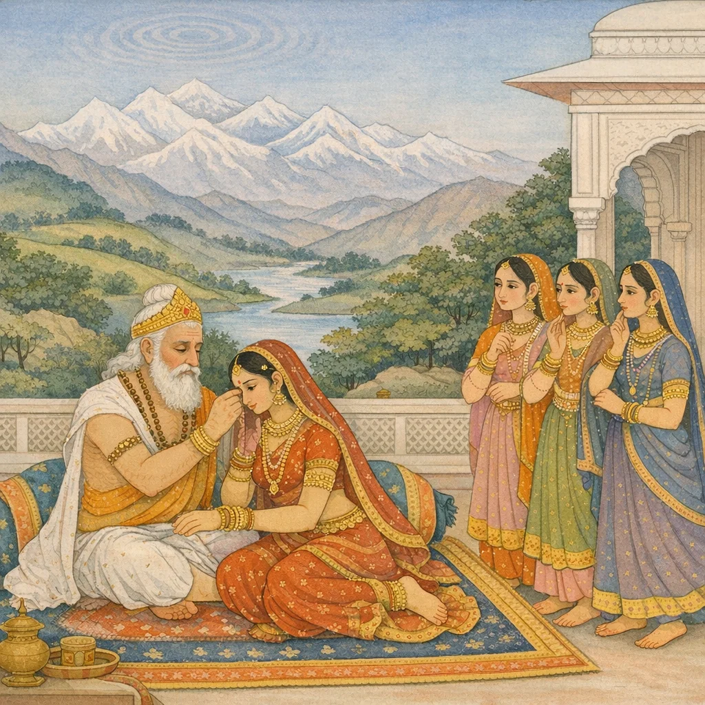 She began to disparage her own appearance and cried, “Alas, I am ruined!” Though her companions consoled and instructed her, the daughter of the Lord of Mountains could not regain clarity of mind.