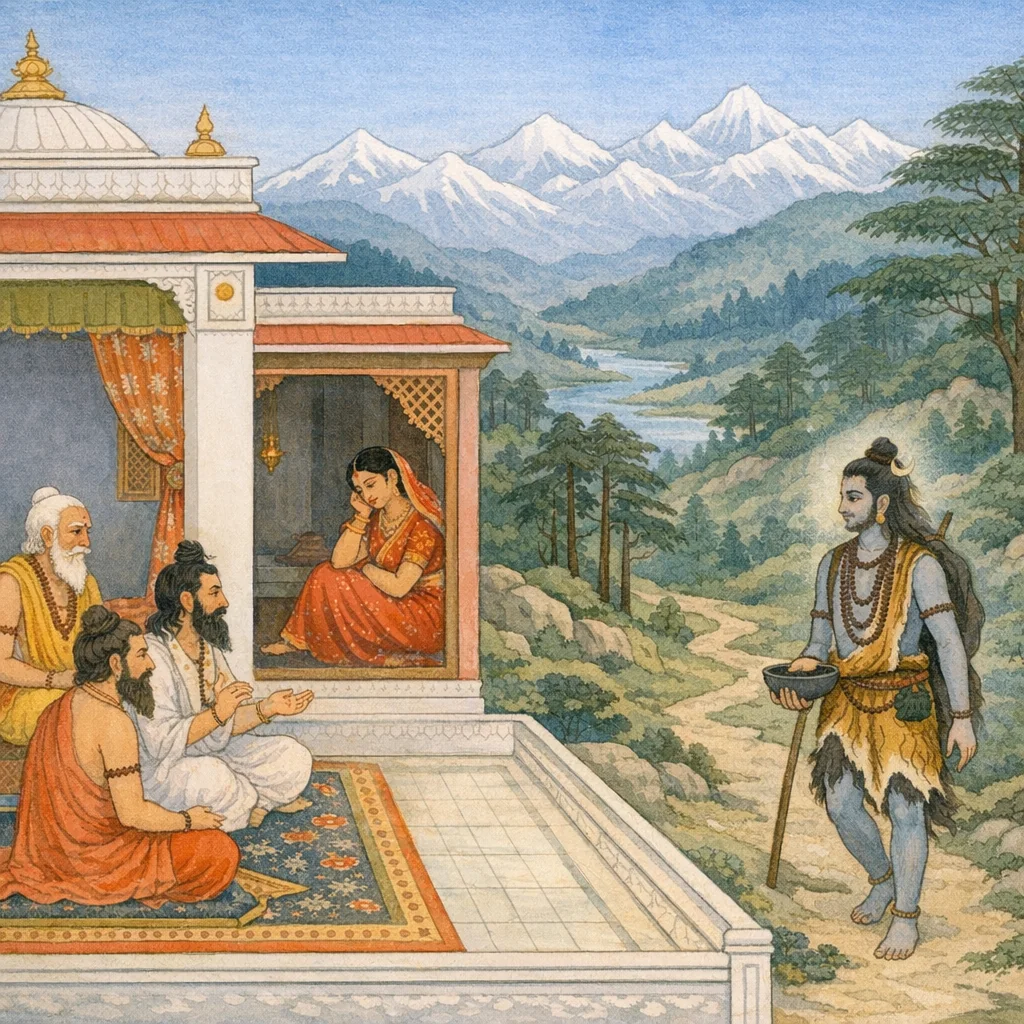 The sages press Himālaya to offer Pārvatī to Śiva, but a contrary Vaiṣṇava-leaning brāhmaṇa’s words trigger Menā’s and Himālaya’s hesitation; the saptarṣis then dispatch Arundhatī to restore clarity and consent.