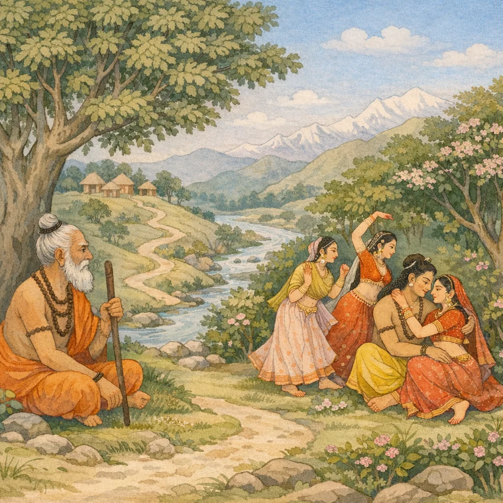 Śambhu/Śiva as the devotional pole; kāma (desire) as a destabilizing force; and the gandharva as the narrative catalyst that redirects Pippalāda’s mental trajectory.