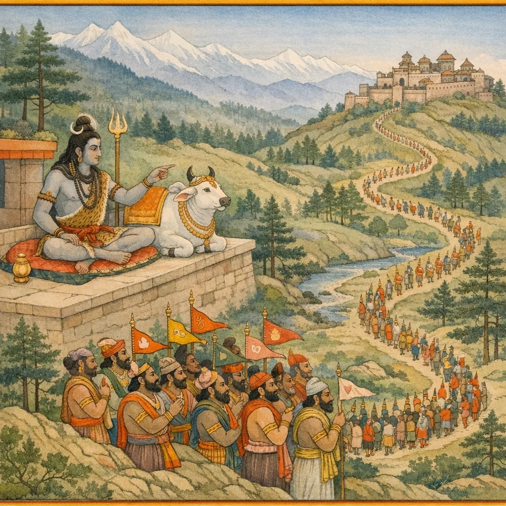 Accompanied by those great sages bearing auspicious offerings, Mahādeva shone forth, adorned in many ways. Proceeding toward the abode of the mountain-lord named Himālaya, he went for the sacred rite of taking Śivā’s hand in marriage.