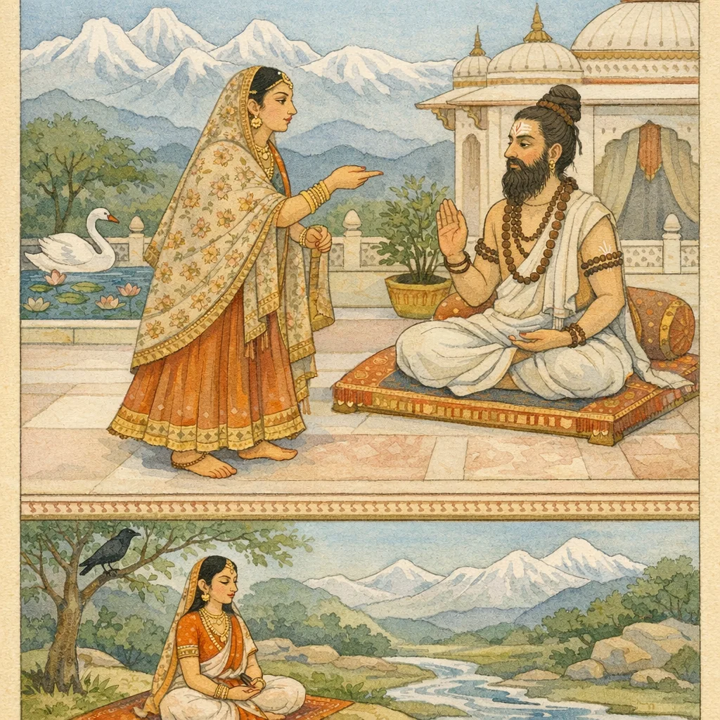 Yet she did not relinquish her stubborn resolve, refusing to give the maiden to Hara (Śiva). Then Menā—bewildered by Śiva’s divine Māyā—gave her consent.