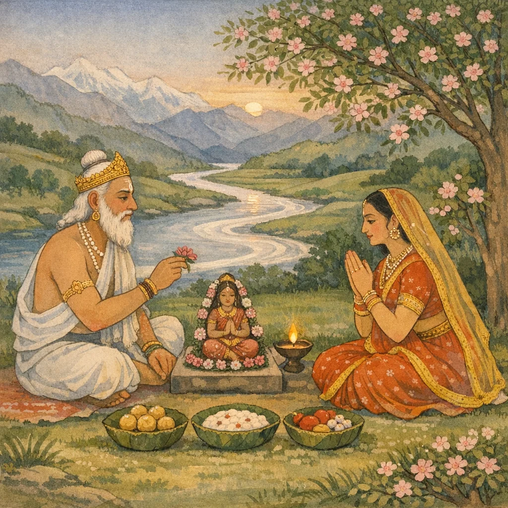 Adhyāya 5 is cast as a dialogue between Nārada and Brahmā. Nārada asks what happened after Devī Durgā withdrew from sight and the gods returned to their abodes, and how Himālaya and Menā performed tapas and worship to obtain a daughter. Brahmā, invoking Śaṅkara, recounts their disciplined bhakti: constant contemplation of Śiva and Śivā, steady pūjā, reverence to the Devī, and gifts to brāhmaṇas to please the Goddess. Menā’s long observance is marked by ritual time—beginning in Caitra and continuing for many years—with fasting on aṣṭamī and offerings on navamī. The chapter details specific upacāras such as modaka, bali/piṣṭa preparations, pāyasa, fragrances, and flowers, and describes making an earthen image of Umā near the Gaṅgā for pūjā with varied offerings. Thus it joins narrative causality (tapas → divine satisfaction → boon and progeny) with prescriptive ritual detail, presenting Menā’s vrata-like worship as a model of efficacious devotion.