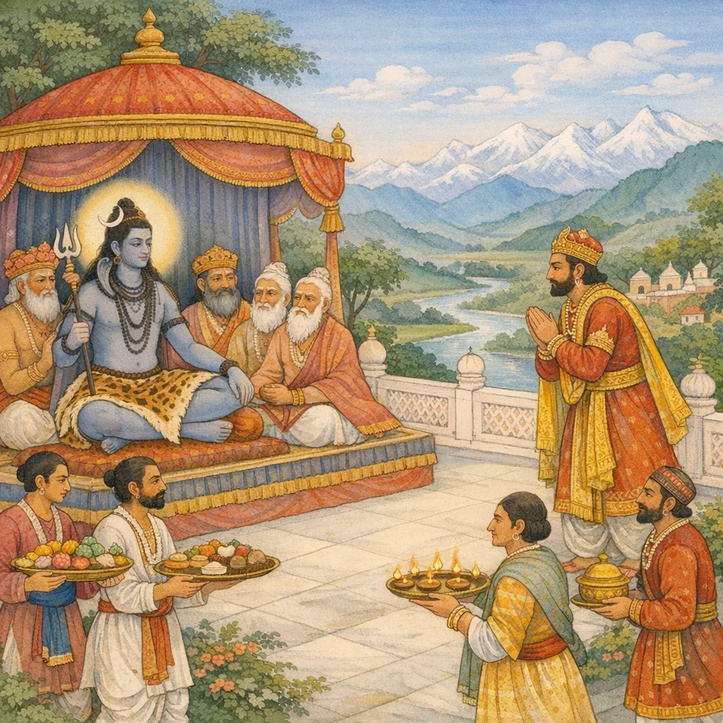 Adhyāya 53 presents a transition scene: the assembled devas and sages, led by Viṣṇu and others, complete their obligatory rites and proceed toward the mountain. The mountain-king (Himālaya/Girirāja) performs purification by ritual bath (snāna), worships his chosen deity, gathers townsmen and kinsmen, and joyfully goes to the settlement to host the divine company. After honoring Śambhu/Maheśāna, he petitions Śiva to stay for some days in his house along with the gods. He praises the transformative power of Śiva’s darśana and declares the host blessed by Śiva’s arrival with the devas. The devas and sages approve, extolling the mountain-lord’s merit and fame, saying none in the three worlds equals his virtue because Maheśāna—Parabrahman and refuge of the good—has come to his door out of compassion for devotees. They further praise the delightful dwelling, the manifold honors, and the extraordinary foods, implying that where Devī Śivāmbikā is present there is no scarcity and every offering becomes abundant and complete. The chapter thus frames hospitality as ritualized bhakti, sanctifying domestic space through the presence of Śiva–Śakti.