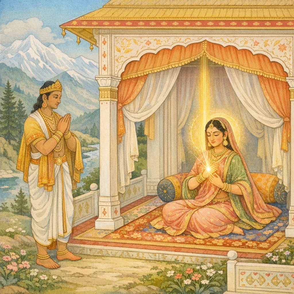 Approaching her, he swiftly perceived the painful thorn of her longing—the very wish she had chosen within her heart. Indeed, what was dear to her was brought at once; for to those who serve the Divine purpose, nothing is truly impossible, even for the gods of the three heavens.