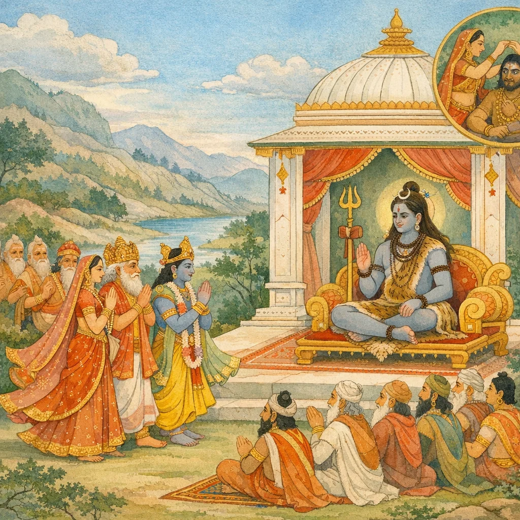 “Just as Padmālayā (Lakṣmī) is to Viṣṇu, and just as Sāvitrī is to me (Brahmā), so too—O Śambhu—accept now a beloved consort, a constant companion for Yourself.”