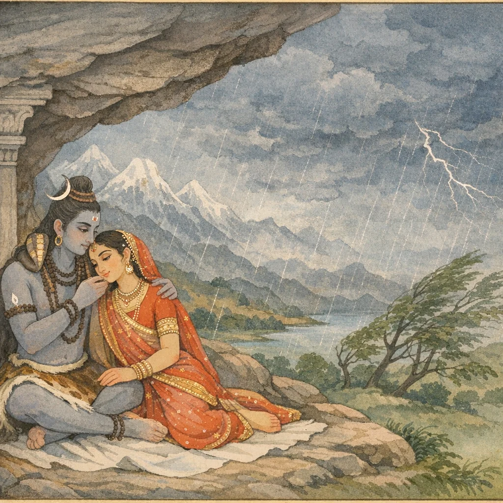 The monsoon functions as an outer mirror of inner states—viraha, agitation, and anticipatory tension—showing how cosmic processes (ṛtu and atmospheric upheaval) can signify shifts in dharma, relationship, and impending narrative conflict.