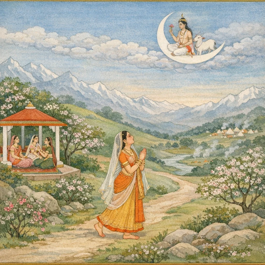 The immediate prelude to the Dakṣa-yajña conflict: Satī discovers that the gods are traveling to Dakṣa’s sacrificial festival and realizes she has not been invited.