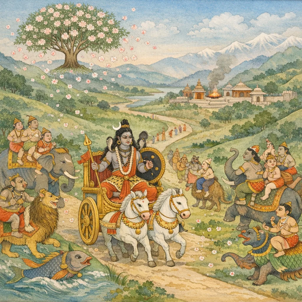 Adhyāya 33 continues the Dakṣa-yajña account by portraying the instant mobilization of Śiva’s hosts upon receiving His command. Brahmā relates that Vīrabhadra, pleased and obedient, bows to Maheśvara and swiftly departs for Dakṣa’s sacrificial arena (makha). Śiva sends innumerable gaṇas as an escort “for splendor,” evoking a royal procession and the inevitability of cosmic decree. The gaṇas array themselves before and behind Vīrabhadra, Rudra-like in nature, while Vīrabhadra’s martial form appears terrifyingly magnificent—adorned in Śiva’s guise, with mighty arms, serpentine ornaments, and a chariot. The imagery expands into a catalogue of mounts and guardians—lions, other formidable creatures, elephants, aquatic and hybrid beings—forming a mythic war-procession. Auspicious signs attend the march: flowers rain from wish-fulfilling trees, and the gaṇas advance with praise and festive exhilaration. The chapter serves as a hinge from divine order to the impending confrontation at the yajña, highlighting Śiva’s authority, the collective śakti of the gaṇas, and the ritual consequences of affronting Śiva.