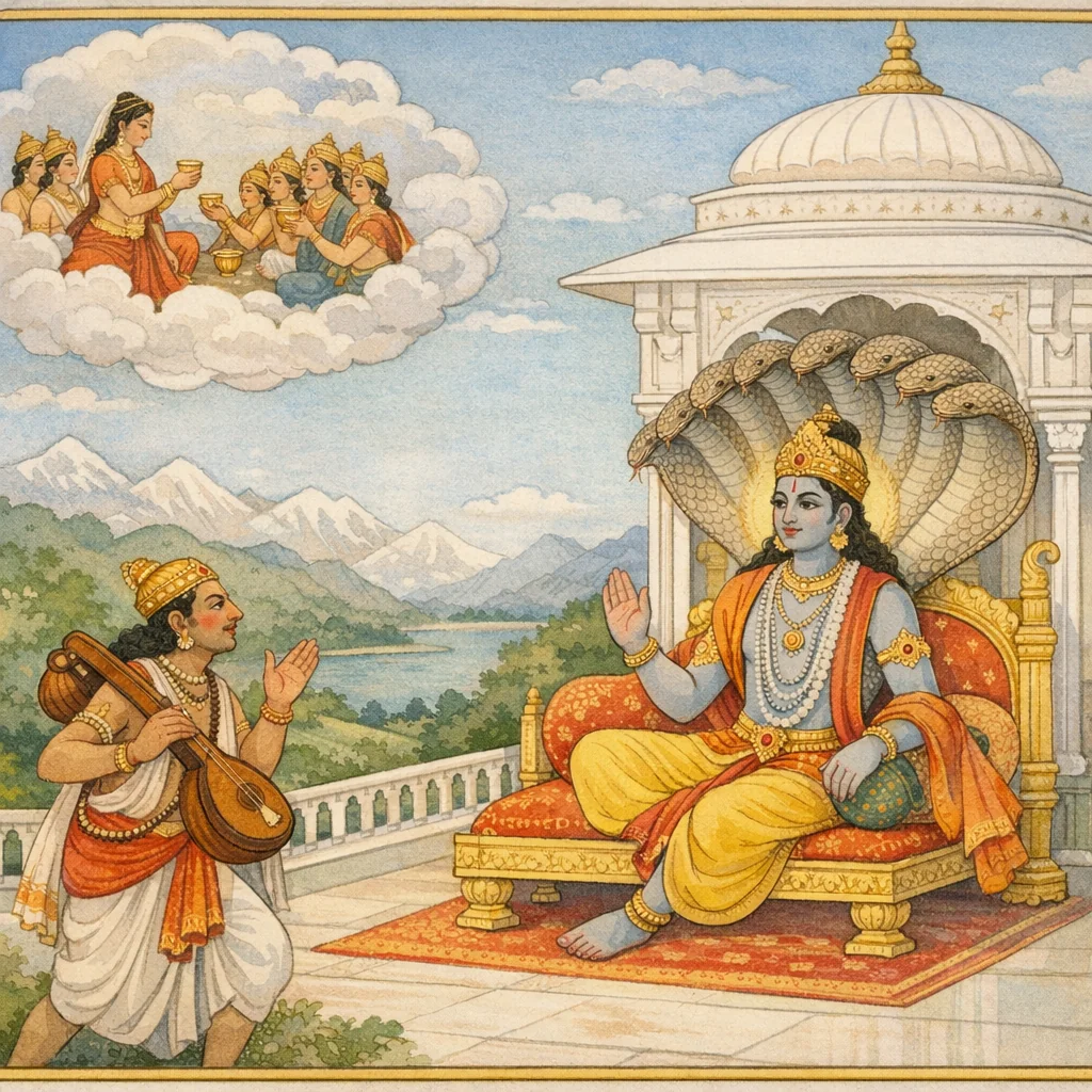 Nārada—deluded and angered—travels to Viṣṇuloka and confronts Viṣṇu, invoking the Mohinī episode and the distribution of vāruṇī to asuras, setting the stage for Viṣṇu’s corrective instruction (upadeśa).