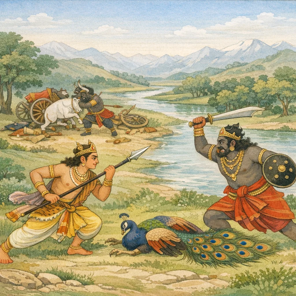 Niśumbha swiftly pierced Kārtikeya’s peacock in the heart with five arrows; and that mount, stunned into faintness, fell to the ground.