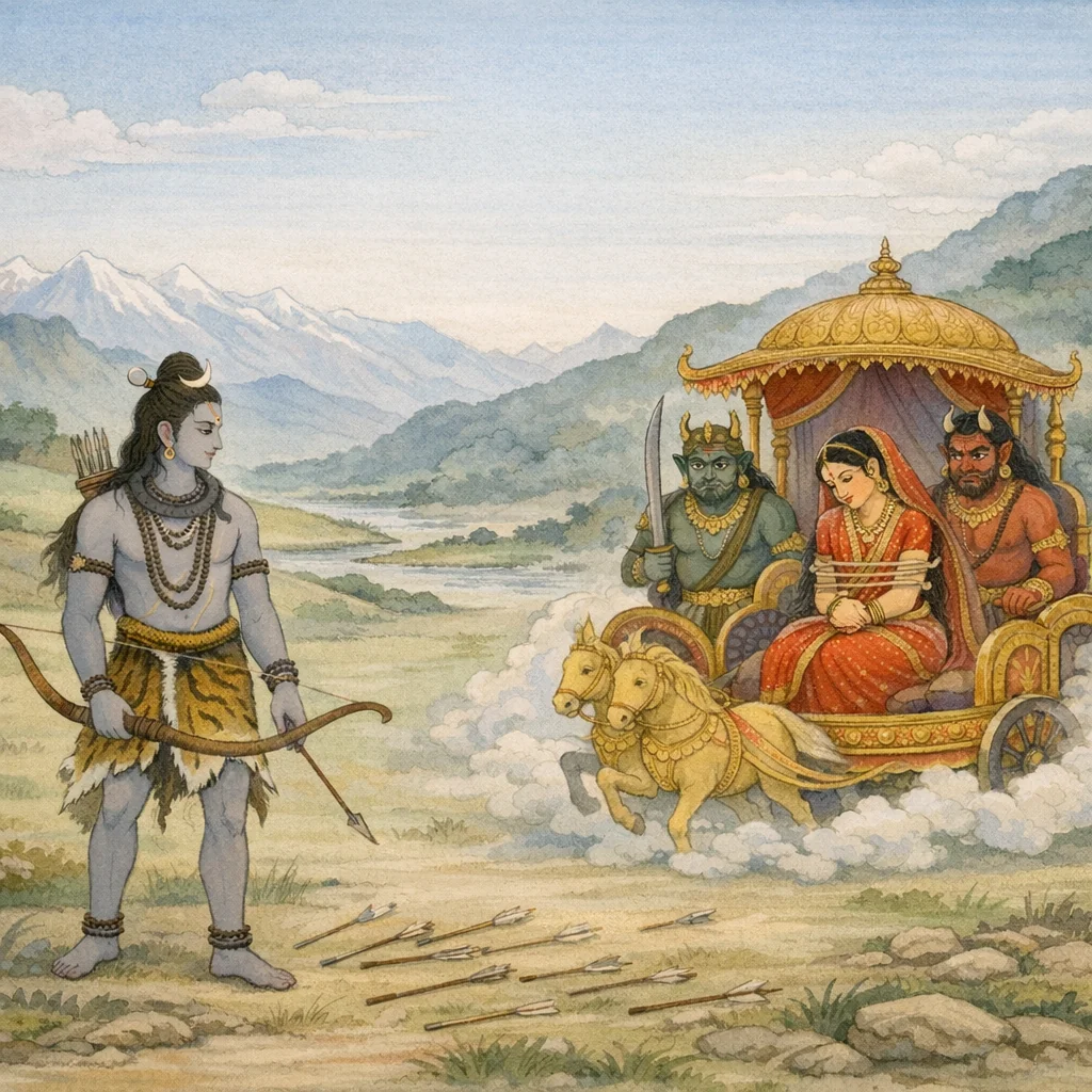 Seated upon the chariot, bound and weeping, Pārvatī was seen by Lord Śiva—being seized and restrained by the demons Niśumbha and Śumbha.