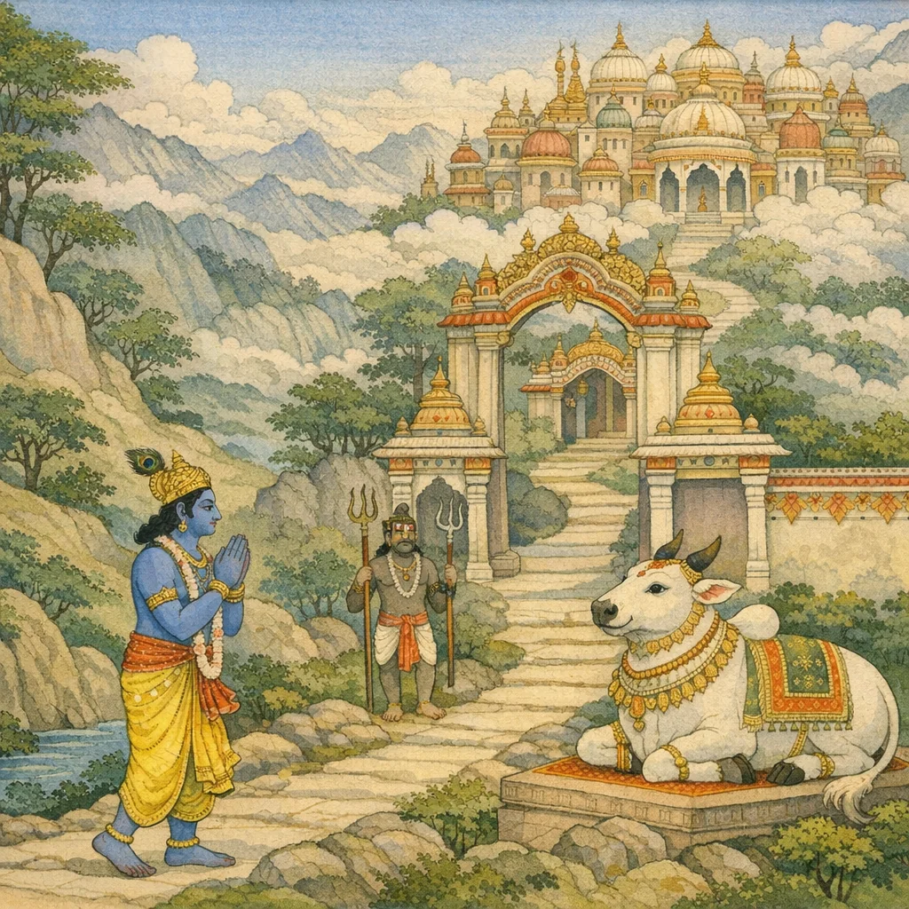 Adhyāya 30 describes entry into Śivaloka through successive gates, each crossed only by formal permission. Sanatkumāra recounts how the arriving deity (with Brahmā/Rameśvara mentioned) reaches the “mahādivya” Śivaloka, a non-material, supportless realm (nirādhāra, abhautika). Viṣṇu, filled with inner joy, beholds a jewel-bright world and comes to the first gateway guarded by gaṇas, then meets dvārapālas seated on jeweled thrones, clad in white and gem-adorned. Marked by Śaiva features—five faces, three eyes, weapons like the triśūla, sacred ash and rudrākṣa—they receive his bow, hear his request to behold the Lord, and grant ājñā to pass. This protocol repeats through many gates (fifteen are named), until the great gate where Nandin appears; after salutation and praise, Nandin authorizes entry, and Viṣṇu enters the inner precinct in delight. The chapter maps sacred space as a graded hierarchy of access, stressing protocol, devotional praise (stuti), and sanctioned entry as prerequisites for nearness to Śiva.