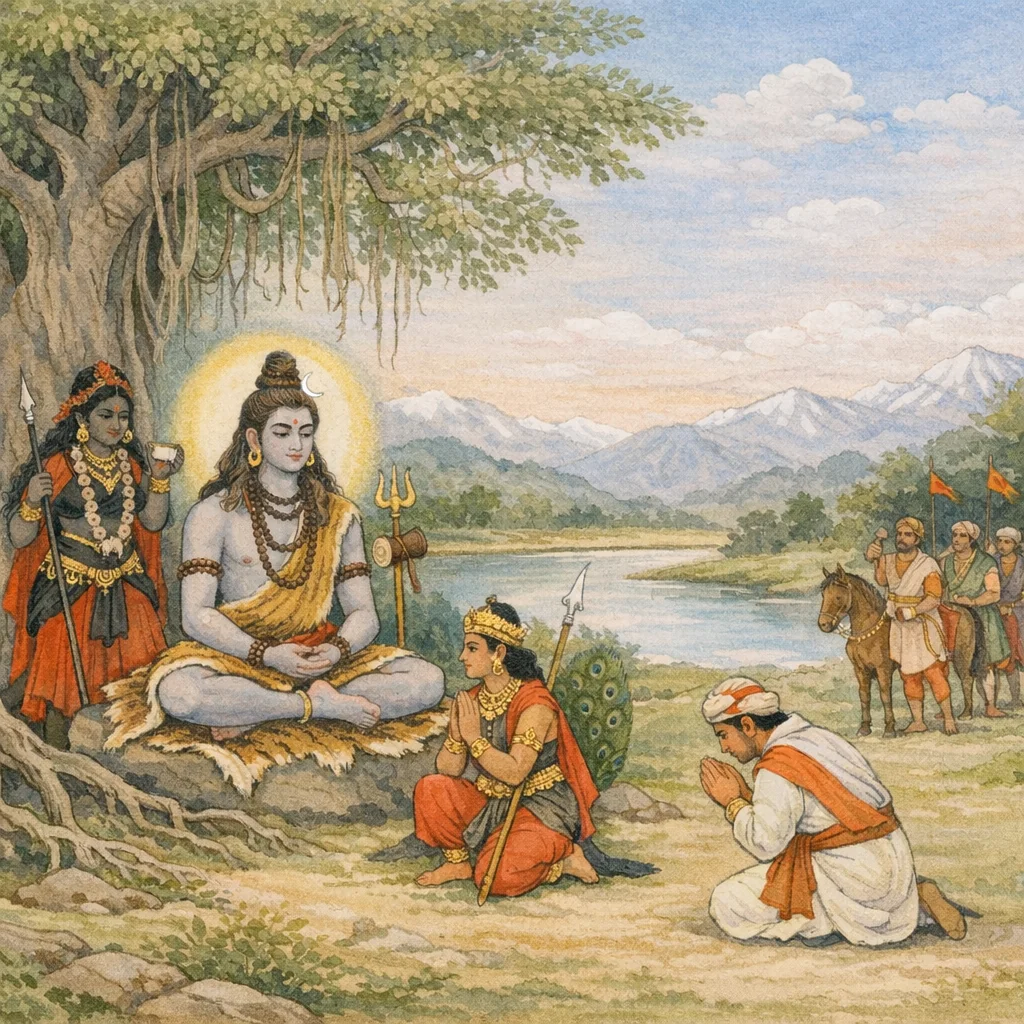 Śiva as yogin and three-eyed lord; Bhadrakālī as protective śakti at his left; Skanda as martial-divine presence before him—together representing sovereignty, power, and command in the war context.