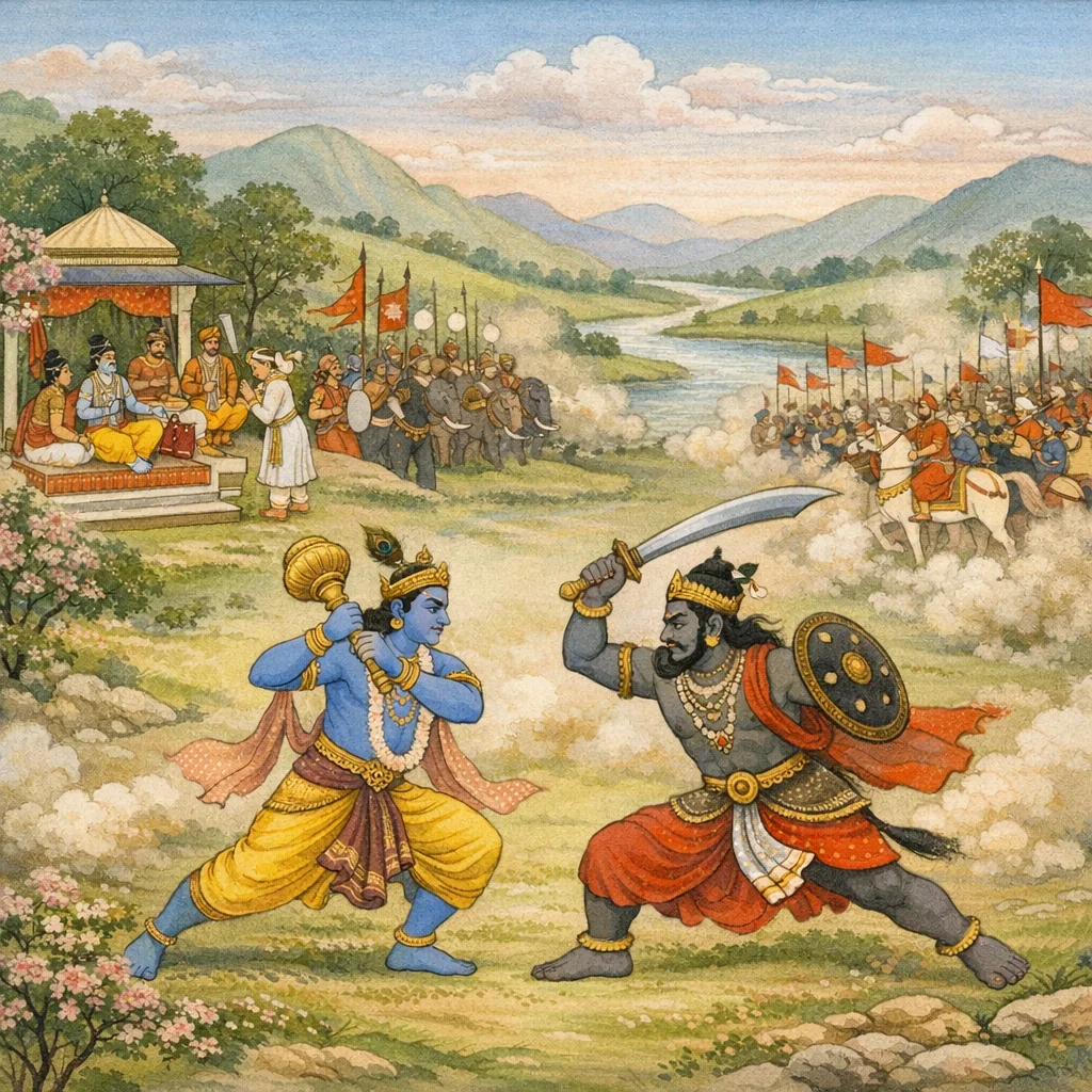 Then a great battle arose, crushing Devas and Asuras alike. In that mighty clash, many divine weapons began to whirl and surge about.