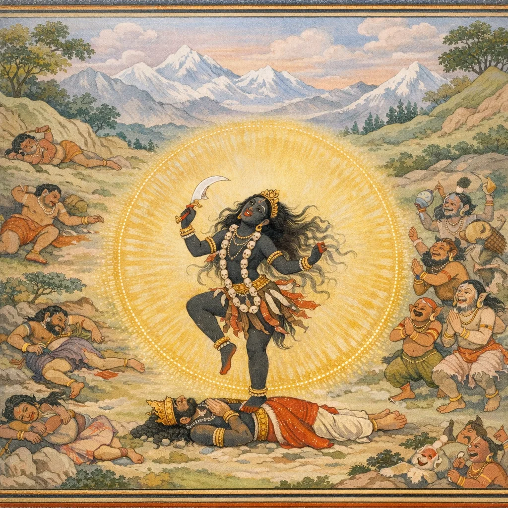Again and again he unleashed a fierce, terrifying peal of laughter; then he drank the honey-wine and danced upon the very crest of the battlefield, revealing amid the combat the awe-inspiring, world-shaking power of Rudra.