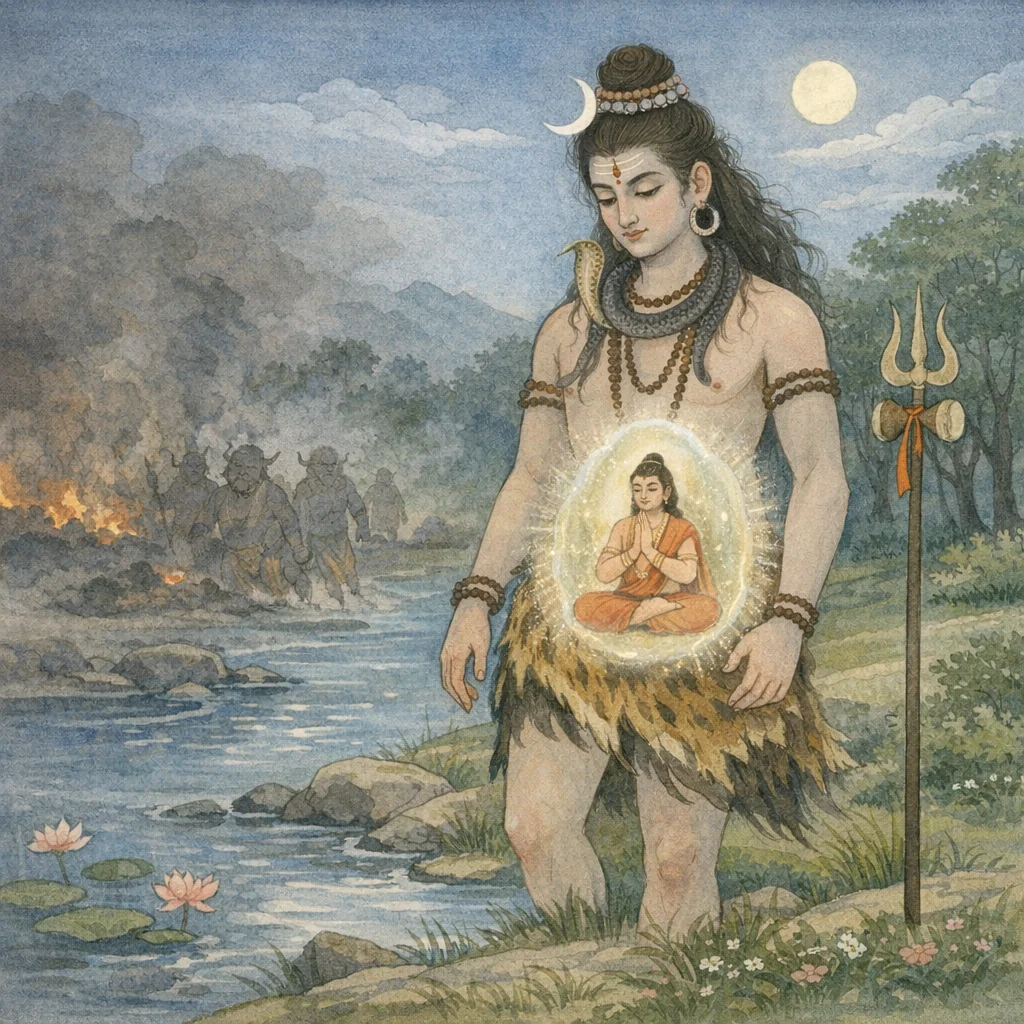 It explores a Shaiva paradox: divine ‘ingestion’ does not imply ordinary destruction. Śiva’s jaṭharānala is invoked as cosmic fire, yet the devotee/agent is preserved—signaling yogic control, grace, and the distinction between divine action and material causality.