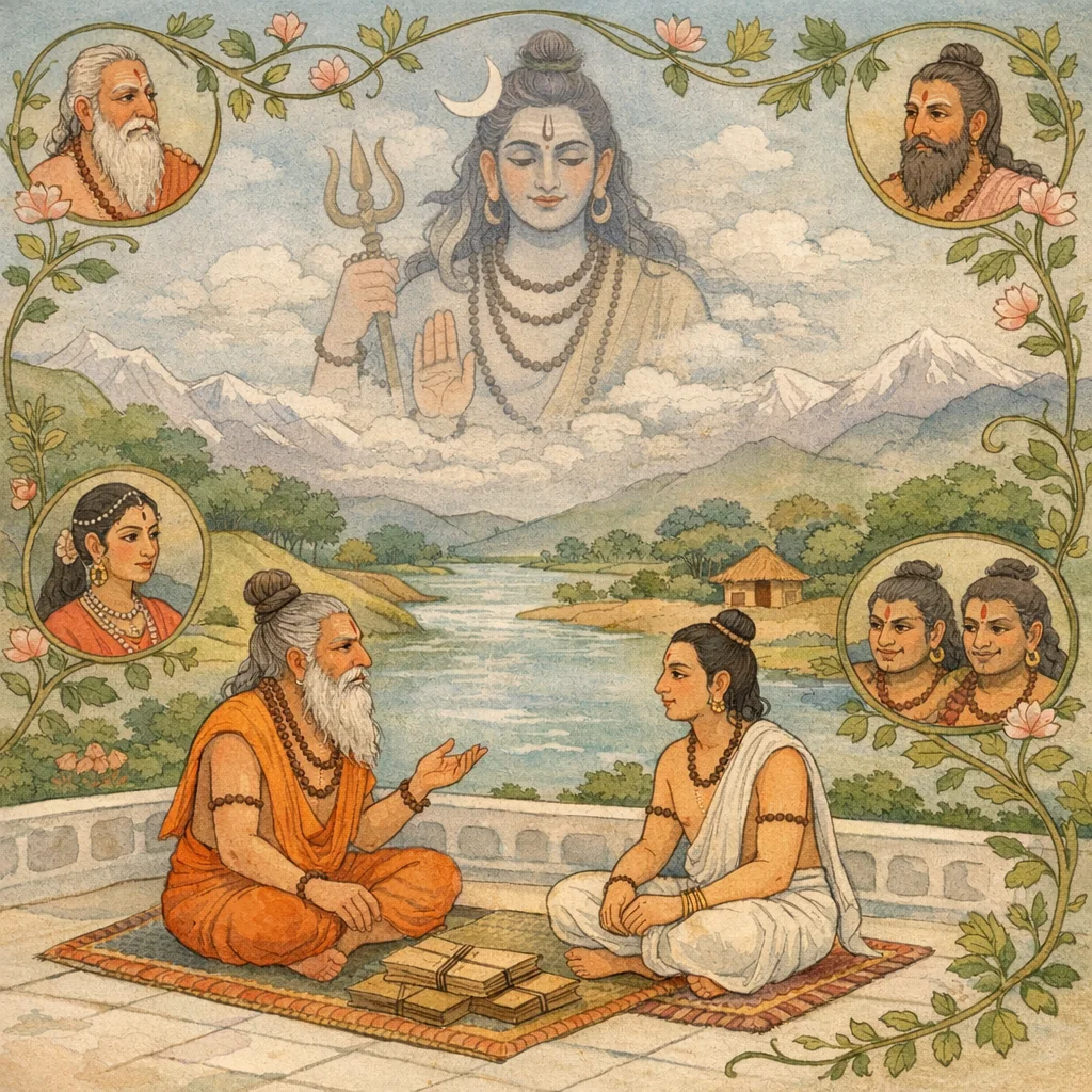 Adhyāya 51 begins with a dialogic handoff: Vyāsa asks Sanatkumāra to recount the carita of Śaśimauli Śiva, especially how Śiva, out of affection, granted Bāṇāsura “gāṇapatya” (affiliation and authority within Śiva’s gaṇa-sphere). Sanatkumāra agrees, presenting the tale as Śiva-līlā and a meritorious itihāsa, meant to delight and to instruct. The chapter then turns to a purāṇic genealogical prelude: Marīci, Brahmā’s mind-born son, is introduced, followed by his son Kaśyapa, a chief agent of cosmic proliferation. Kaśyapa’s marriages to Dakṣa’s daughters are noted, with Diti highlighted as the eldest and mother of the Daityas. From Diti are born two mighty sons—Hiraṇyakaśipu (elder) and Hiraṇyākṣa (younger). This genealogical framework serves as the causal setup for later asura lineages and for Bāṇa’s emergence, preparing the ethical-theological question of how an asura can nevertheless receive Śiva’s grace and gaṇa-status.