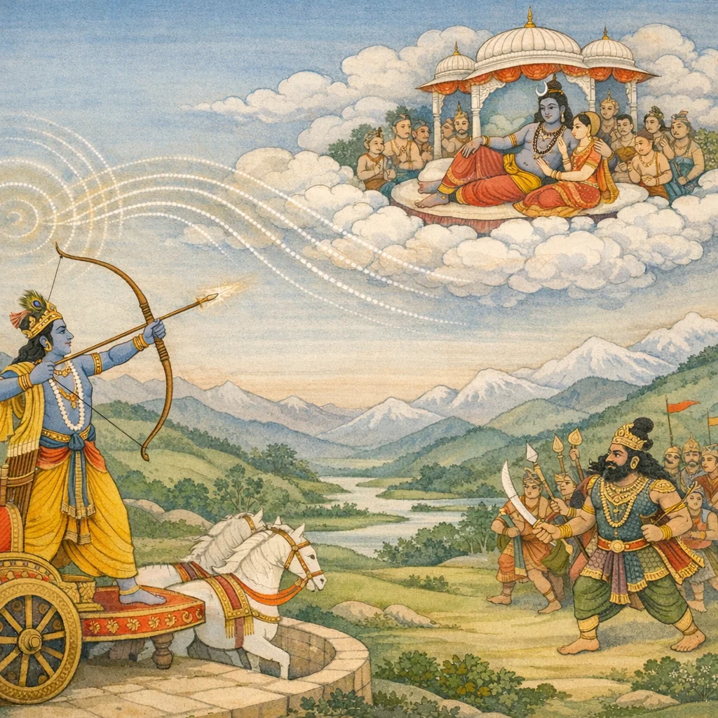 Astra-power (Jṛṃbhaṇāstra), heroic tejas (splendor/force) of Kṛṣṇa, and nāda-śakti (the bow’s resonance filling the cosmic space), alongside Bāṇa’s daitya-bala and multi-weapon engagement.