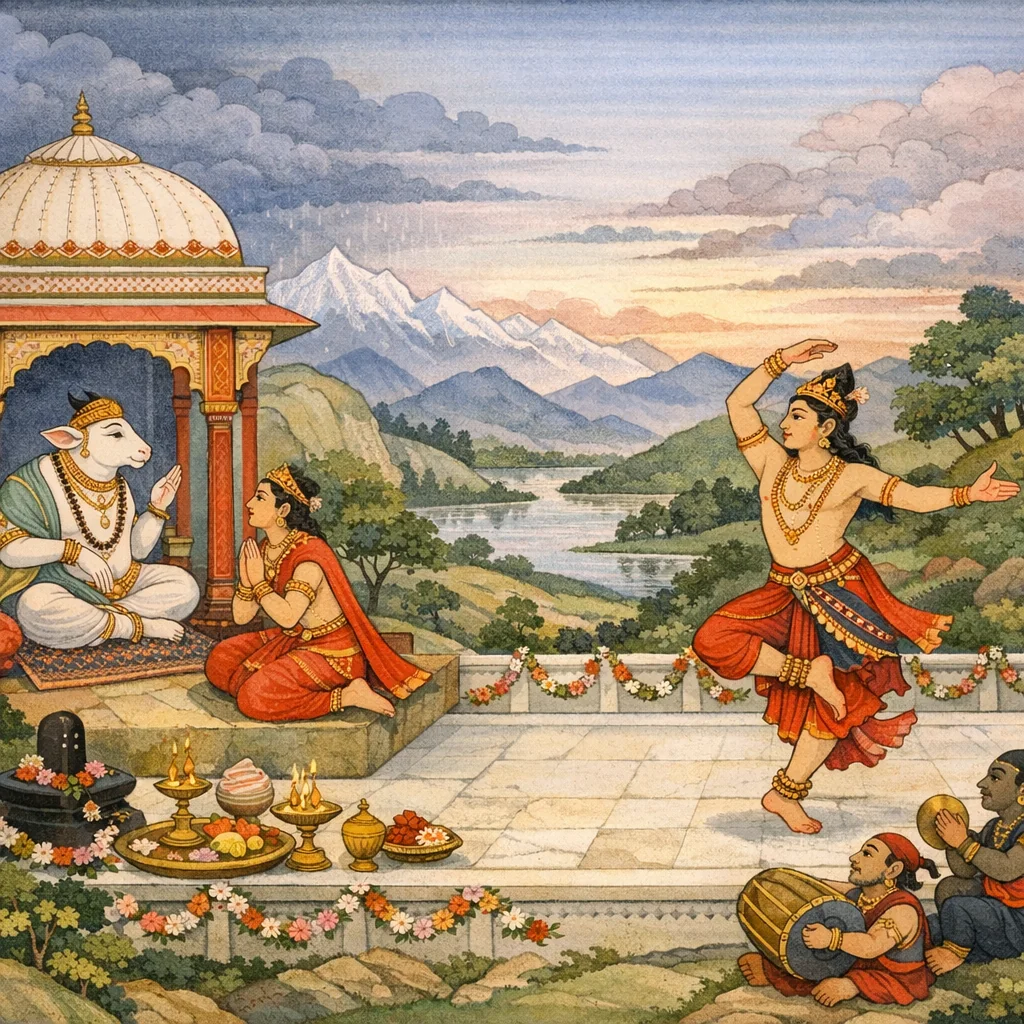 Śiva is highlighted as Śambhu/Śaṅkara the bhaktavatsala (compassionate to devotees), while devotion manifests through stotra, prostration, and tāṇḍava—ritualized speech and body as vehicles of bhakti.