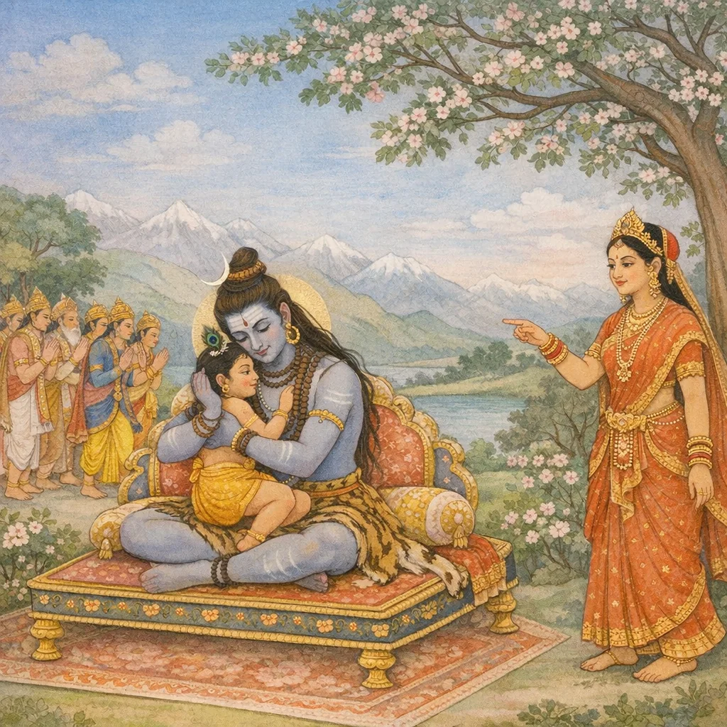 The devas’ acclamation and reverential praise of Śiva coincides with Devī’s arrival with her sons, centering on Skanda (Ṣaṇmukha) as Śiva embraces him and becomes absorbed in familial līlā.
