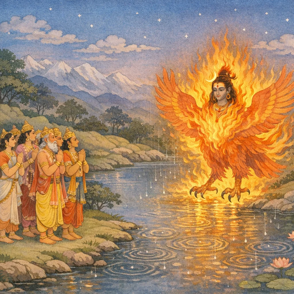 For the welfare of the gods, Sadāśiva assumed a wondrous, divine form—Śārabha—radiant with a splendor like blazing flames.