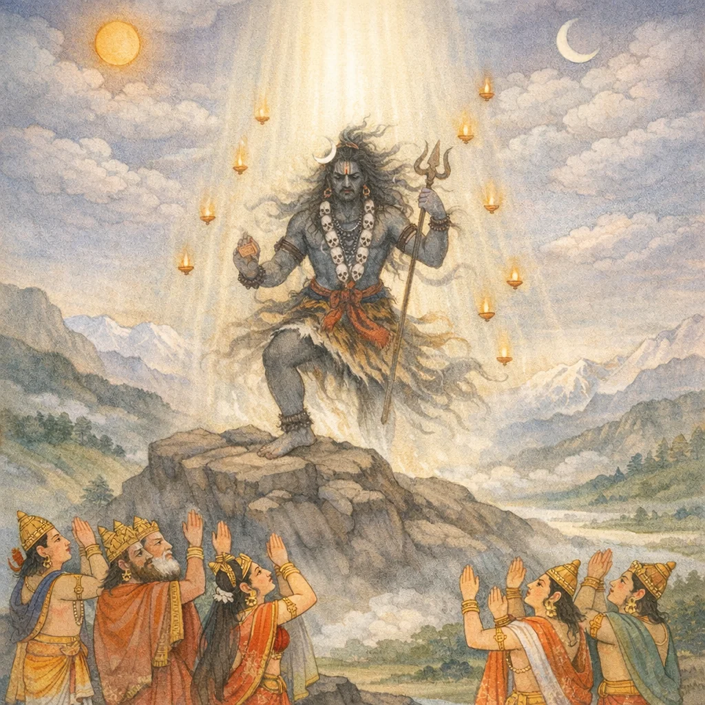 He appeared as the Thousand-armed One, matted-haired, with the crescent moon set upon His crown. With a body both magnificent and formidable, He also manifested as a winged, beaked “twice-born” (dvija)—a bird-form—revealing yet another of Rudra’s countless saguṇa embodiments.
