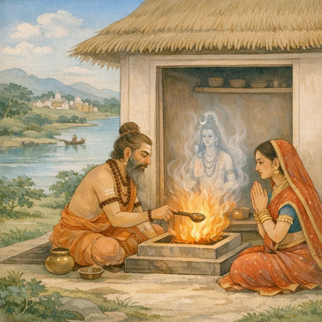 Agni functions as a double symbol: the external sacrificial fire maintained by the gṛhastha and the internal fire of purity/discipline that "cooks" karma into spiritual readiness. The title Gṛhapati further sacralizes the household as a legitimate altar-space where Śiva can be encountered through ācāra.
