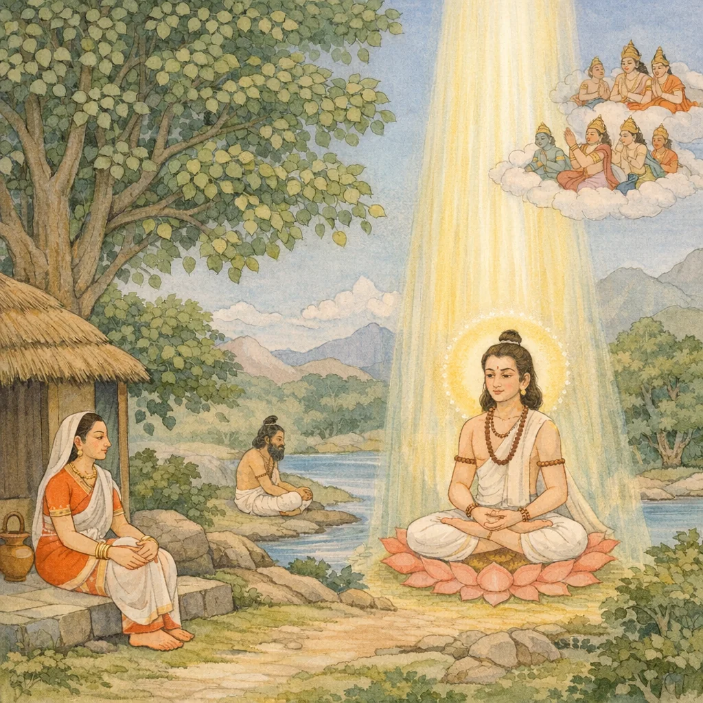 The celestial voice said: “O wise one, do not act rashly. Hear my highest counsel: the radiant spiritual power of the sage is within your womb—strive carefully to bring it forth.”