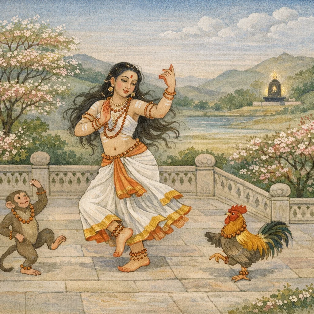 Adorning a monkey and also a rooster with rudrākṣa beads, she would continually make them dance—accompanied by clapping of hands and by songs.