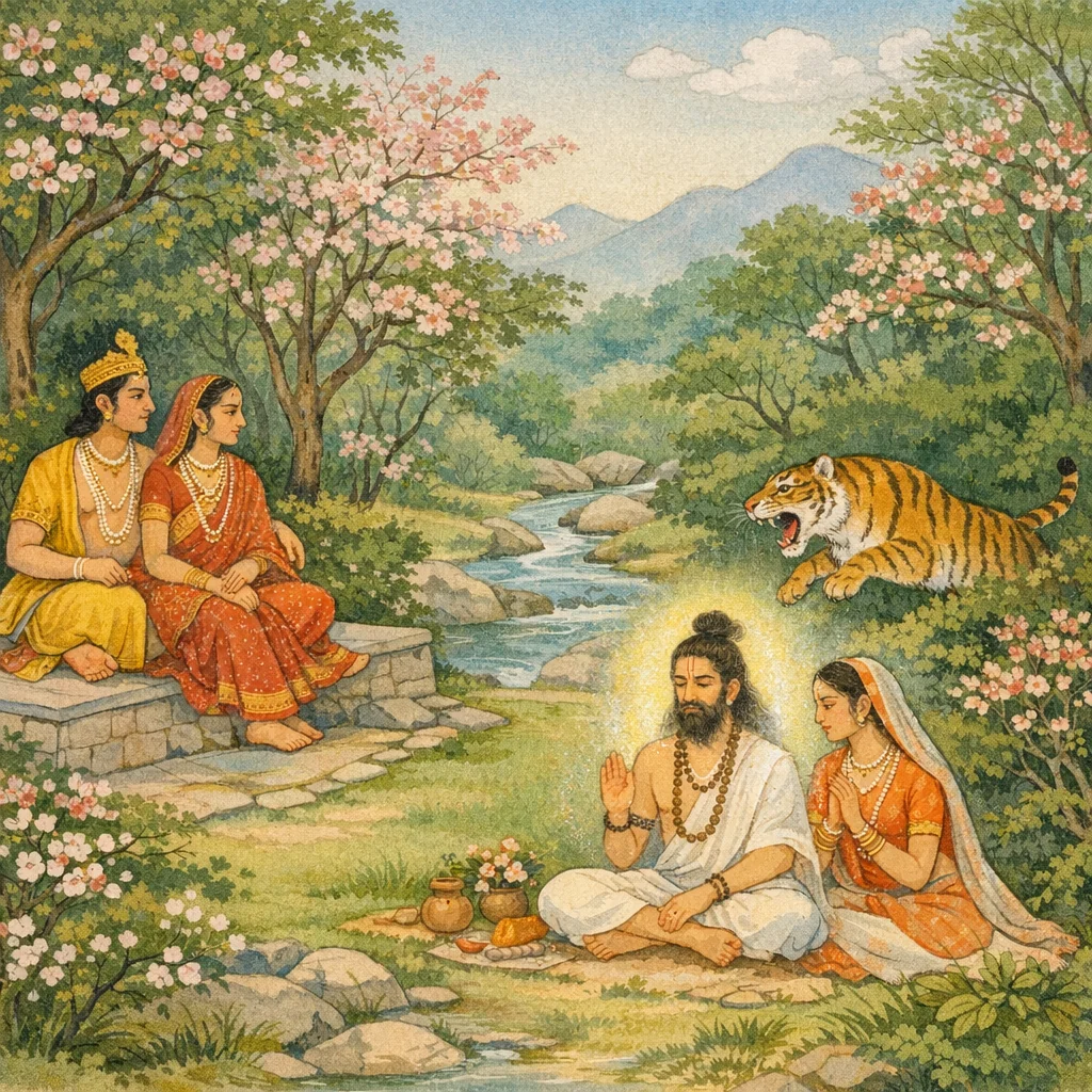 This adhyāya, spoken by Nandīśvara, proclaims an exposition of Śiva Paramātman’s “Dvijeśvara-avatāra,” a revelatory descent meant to test the firmness of dharma. It recalls King Bhadrāyu, once blessed by Śiva in the form of Ṛṣabha, by whose power he conquers foes and gains the throne. The setting is grounded through Queen Kīrtimālinī (daughter of Candrāṃgada, born of Sīmantinī), establishing the genealogical and social frame for the moral trial. In spring the king enters a dense, lovely forest with his beloved for recreation. There Parameśvara Śaṅkara, with Śivā, begins a deliberate līlā: they appear as a brāhmaṇa couple (dvija-dampatī) and conjure, by māyā, a tiger to evoke fear, flight, and pleas for refuge. The impending encounter is designed to reveal the king’s response under distress and apparent vulnerability, turning royal virtue into a Śaiva lesson on grace, illusion (māyā), and discerning true dharma under pressure.