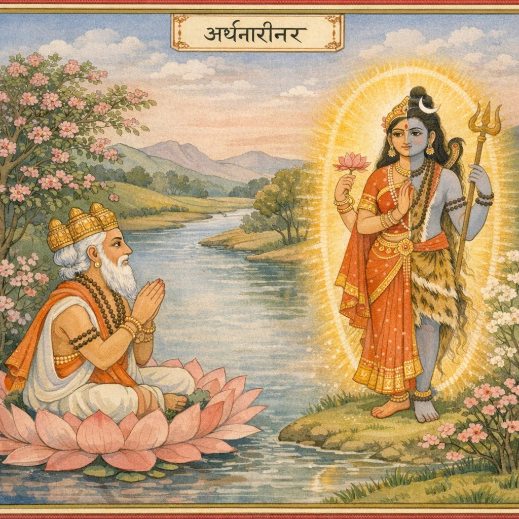 Brahmā’s creation fails to proliferate; instructed to create through paired generation, he realizes feminine lineage cannot arise without Śiva’s power. Through tapas, he gains Śiva’s appearance as Ardhanārī-nara, establishing that cosmogenesis requires Śiva-Śakti co-presence.