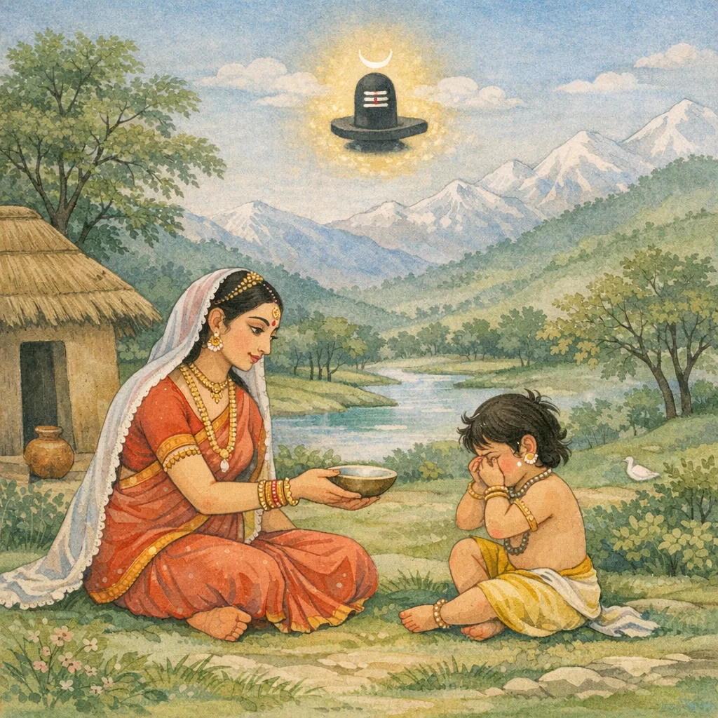 Once, while staying at his maternal uncle’s hermitage, he drank only a very small quantity of milk. Still longing for milk, he affectionately begged his mother again and again for more.