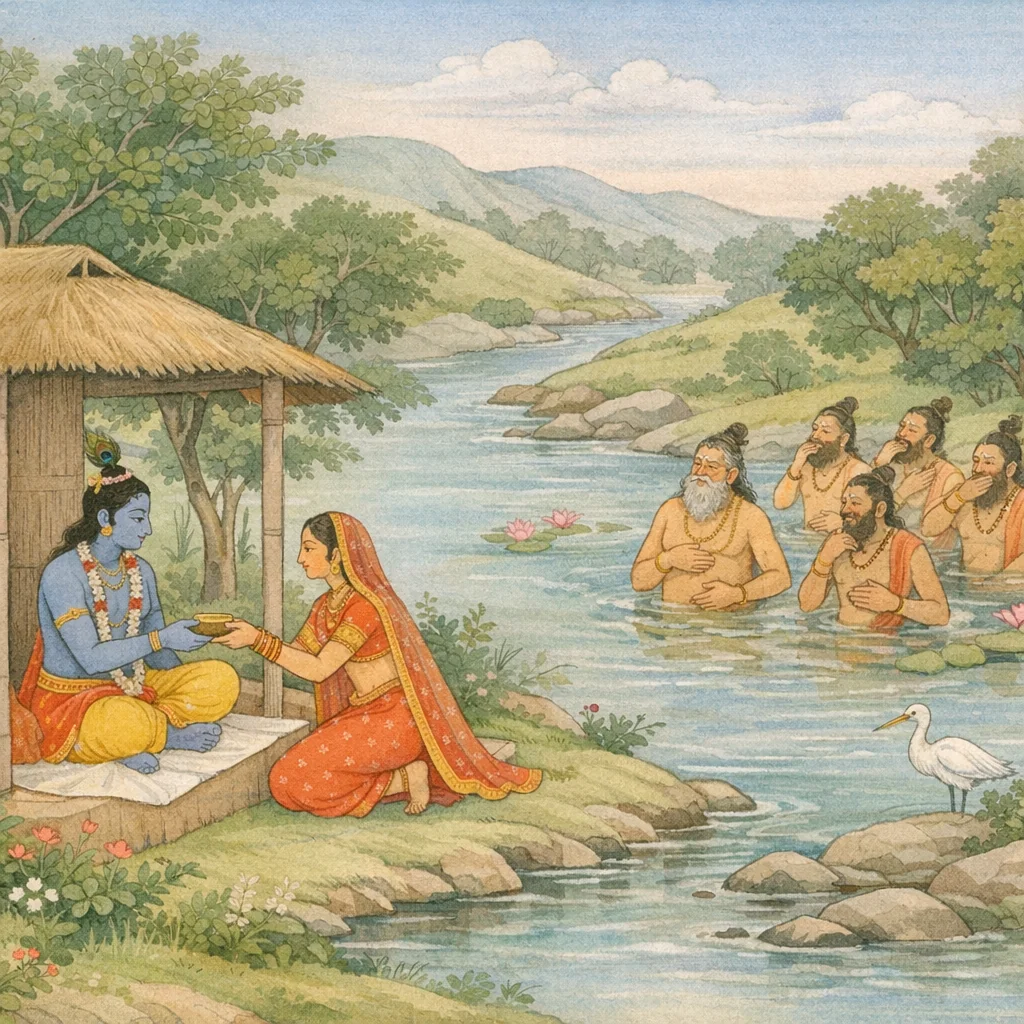 The ‘last morsel’ (śāka) functions as a ritual-symbol of sufficiency through anugraha: when devotion is intact, the smallest remainder becomes plenitude. The bathing interval (snāna) marks the liminal window of karmic testing, where anxiety peaks and remembrance becomes the decisive yogic act.