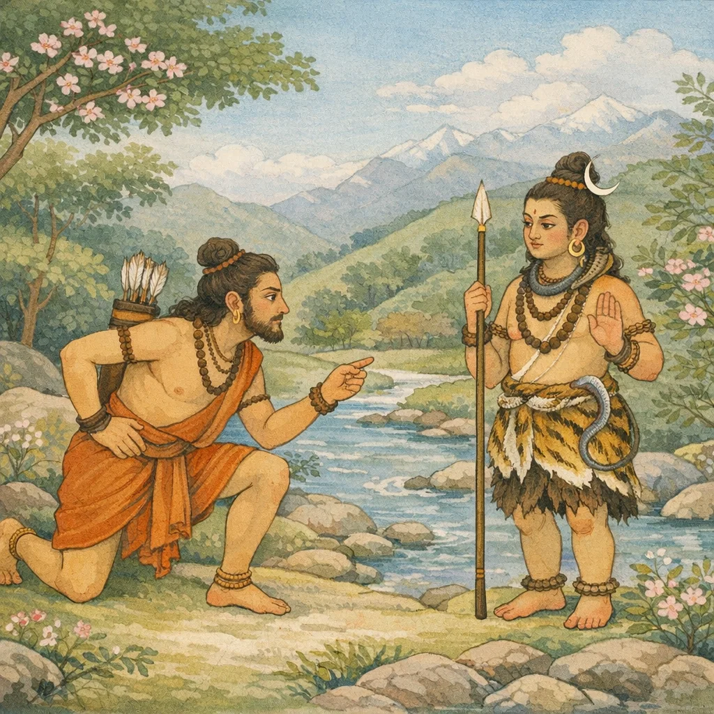A contest over a bāṇa between Arjuna and a Śiva-gaṇa is used as a theological-ethical argument: divine authority is not validated by status or outward marks but by dharmic conduct, and Śiva’s agents intervene to correct ego and reorient the aspirant toward authentic discipline.