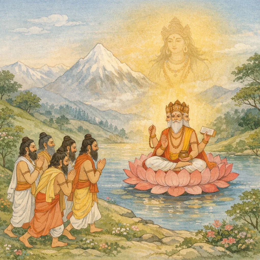 All the divine seers went to the wondrous and delightful peak of Mount Meru, where Brahmā, the sovereign lord, was abiding—desiring to know the true principle (tattva) with right discernment.