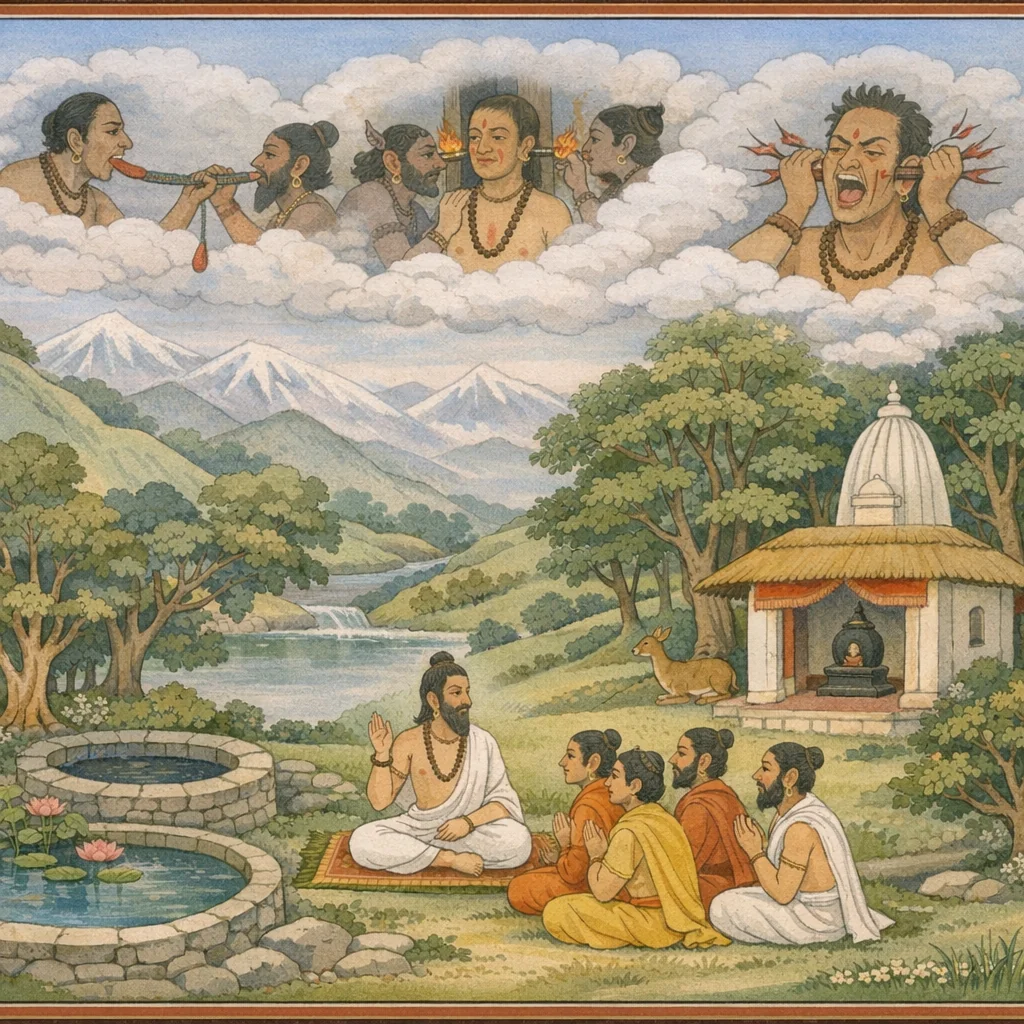 Rather than a single mythic episode, the chapter advances a theological-ethical argument: karmic law is precise and speech/actions against dharma—especially false teachings, abuse of elders, saint-blame, and desecration of Śiva’s sacred works—generate correspondingly precise naraka consequences.
