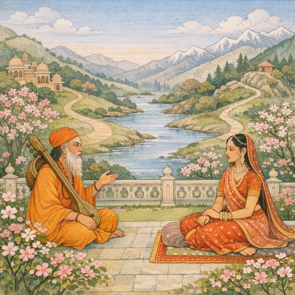 Adhyāya 24 opens with Vyāsa asking Sanatkumāra for a concise recollection of an earlier, morally cautionary teaching connected with Pañcacūḍā. Sanatkumāra announces an exposition on “strīṇāṃ svabhāva” (women’s nature), meant to kindle intense dispassion (vairāgya) simply by hearing. The chapter then cites an ancient exemplum (itihāsa): Devarṣi Nārada, wandering through the worlds, meets the apsaras Pañcacūḍā and questions her to resolve a doubt. She first requires competence and relevance; Nārada assures her he seeks no improper use, but knowledge of behavioral tendencies as a tool of discernment. Sanatkumāra presents her reply as a didactic means to diagnose attachment and to warn seekers of mokṣa against entanglement in sense-objects. The inner purport is not ethnography of women but renunciatory rhetoric—using sharp social imagery to intensify detachment, turn attention from kāma toward liberation, and stress vigilant non-negligence (apramāda) for spiritual aspirants.
