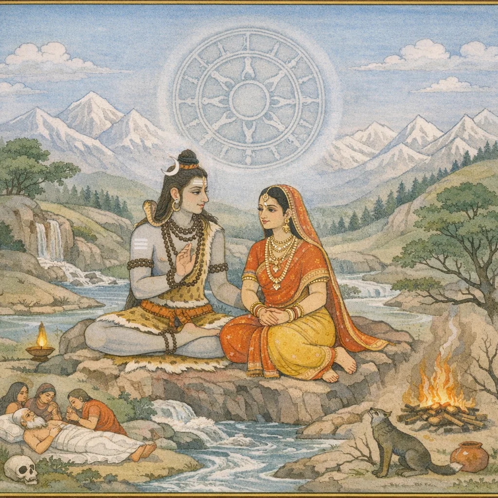 A theological instruction-scene: Pārvatī, after learning worship and mantras, requests clarification on the wheel of time (kālacakra) and the evidences of lifespan and death; Śiva responds by authorizing kālajñāna as a ‘supreme śāstra’ meant for human benefit and spiritual detachment.