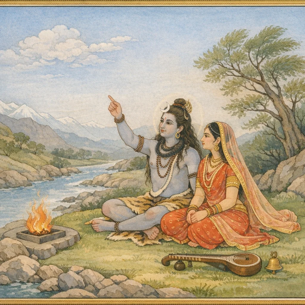 Adhyāya 26 unfolds as a direct dialogue between Umā and Śaṅkara on kāla-jñāna and “kāla-vañcana”: not a literal escape from cosmic law, but a yogic transcendence of time’s binding power. Umā asks how yogins grounded in tattva should face the ever-present imminence of kāla and mṛtyu. Śaṅkara replies for the welfare of all, beginning with elemental ontology: the body is pañcabhāutika (earth, water, fire, air, space), and ākāśa is taught as all-pervasive, the field into which things dissolve and from which they arise again, illuminating impermanence and continuity. The teaching links this analysis to steadiness (sthira-bhāva) and higher knowing (jñāna), upheld by tapas and mantra-bala. Resonant sound and instruments such as the ghaṇṭā and vīṇā serve as cues to nāda/ākāśa symbolism, hinting at an inner acoustics of practice. The chapter resolves the tension between time’s fearful sovereignty and the yogin’s freedom by locating “victory over time” in realized knowledge and non-identification with the perishable composite.